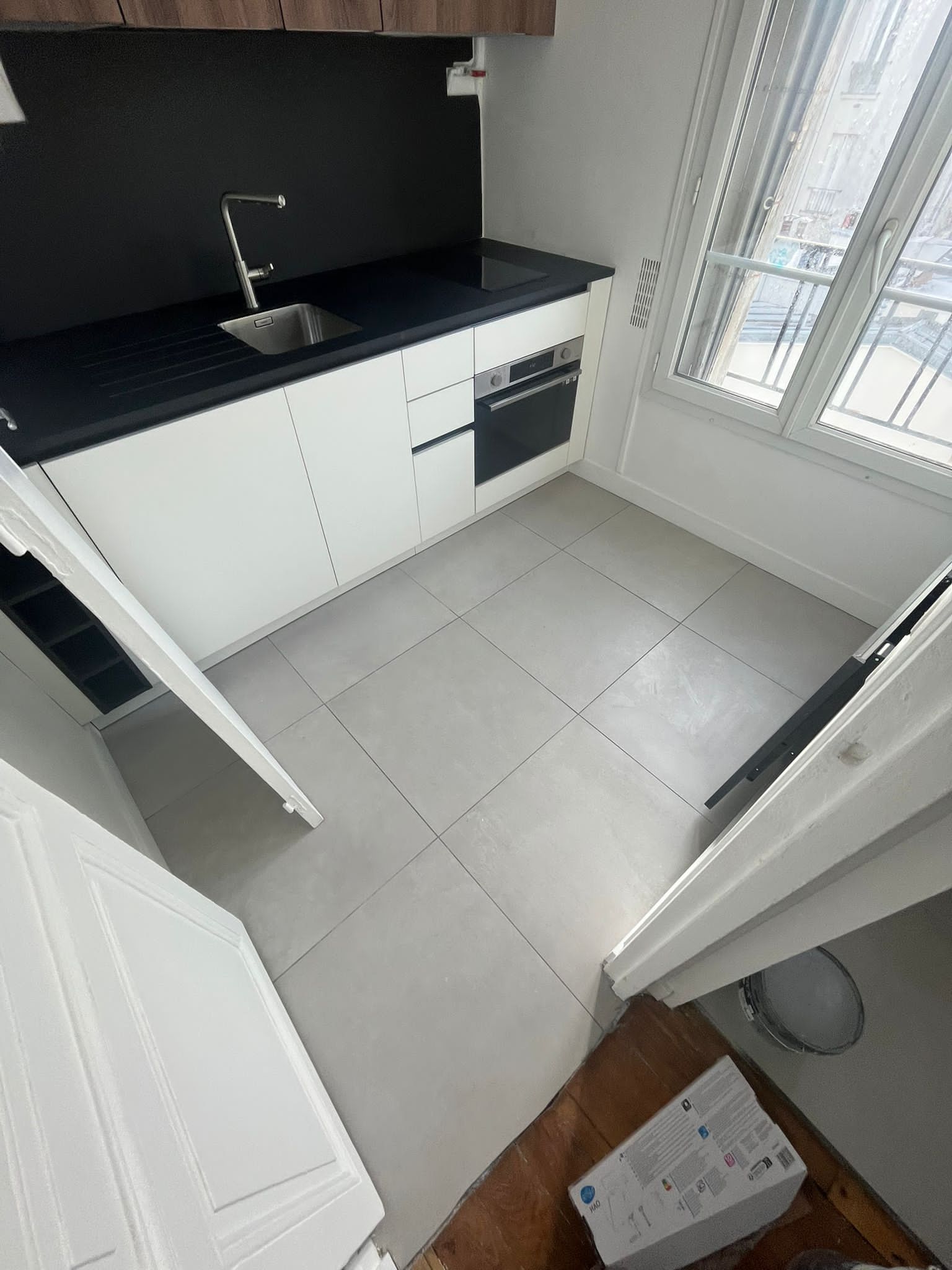 Dans ce projet de raffraichissement d'un appartement haussmannien à Paris 14, Belmard Batiment a méticuleusement rénové chaque pièce, en intégrant des éléments modernes tout en respectant le style historique de l'appartement. La cuisine a été refaite avec des meubles blancs, une crédence noire et un carrelage gris au sol, créant un contraste élégant et contemporain.