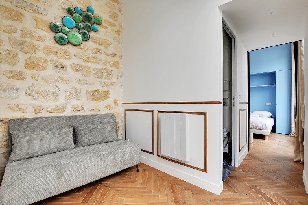 Les travaux ont permis d’apporter plus de modernité et de meilleures performances. Pour autant, l’objectif n’a jamais été de transformer le lieu. Les éléments existants ont été conservés dès que cela était possible. On retrouve ainsi les moulures, les cheminées en pierre, les parquets massifs et les menuiseries anciennes, typiques du 2e arrondissement.
