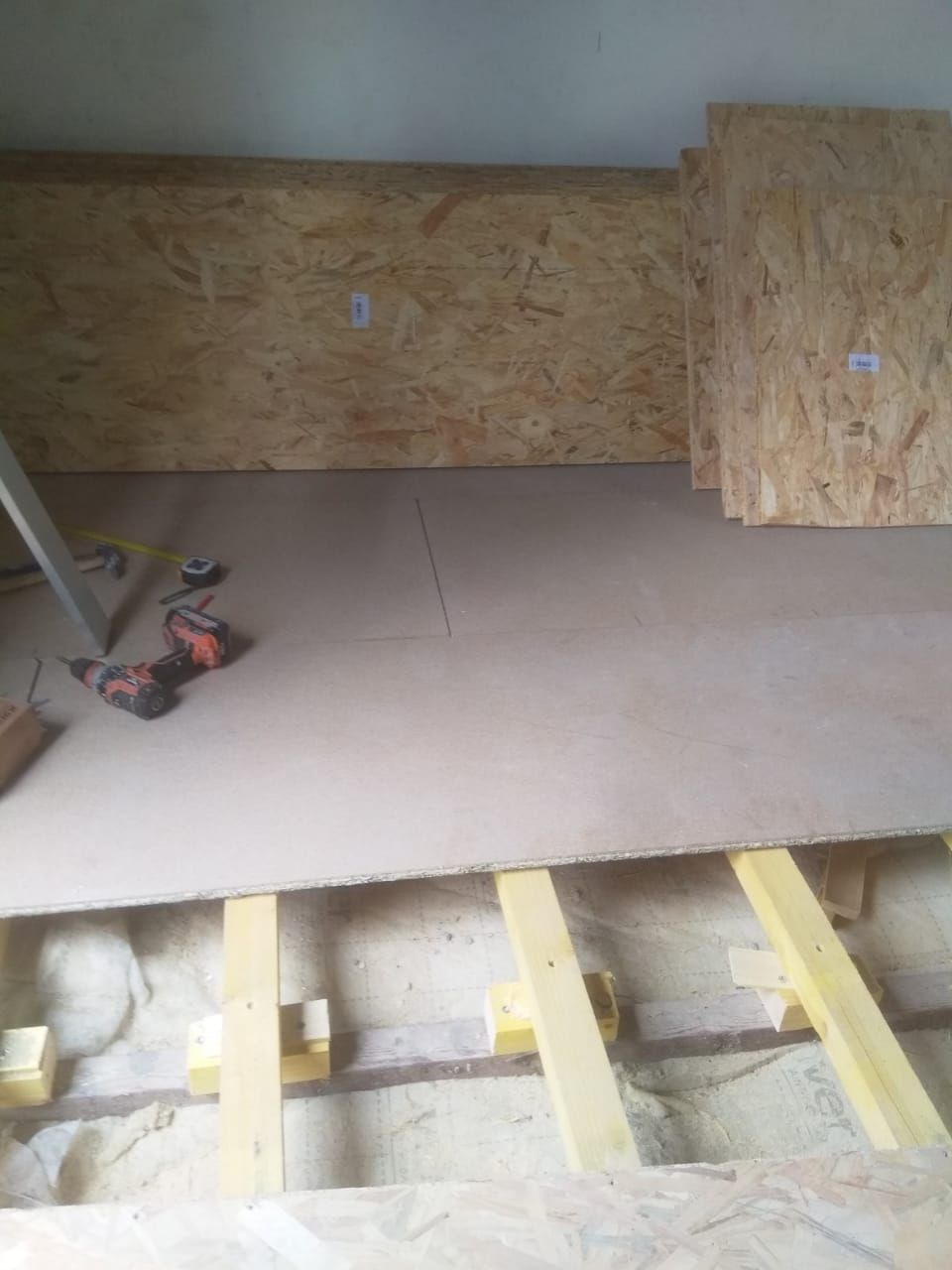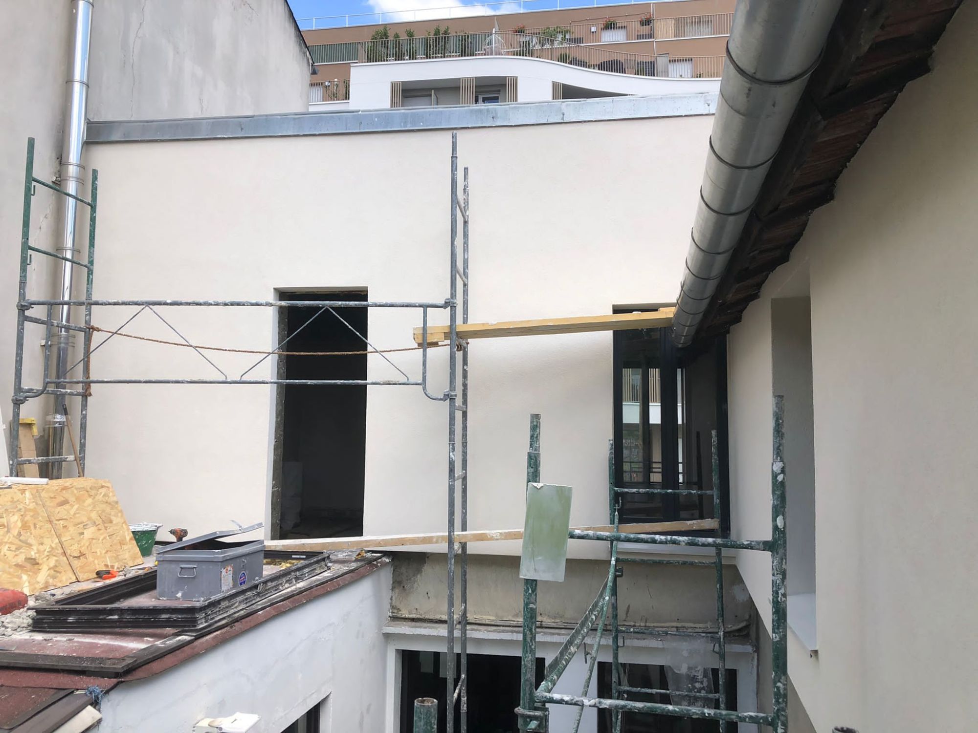Dans un premier temps, nous avons procédé à la mise en place des isolants pour les planchers en laine de roche plaqué en OSB, ainsi que l'isolation des plafonds en laine de roches de 20 cm plaqué en BA13. Nous avons également procédé à l'isolation des murs par l'extérieur à l'aide de plaques de polystyrène de 12 cm recouvertes d'un entoilage puis d'un crépis.