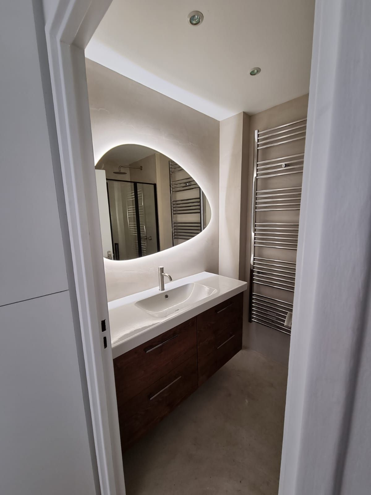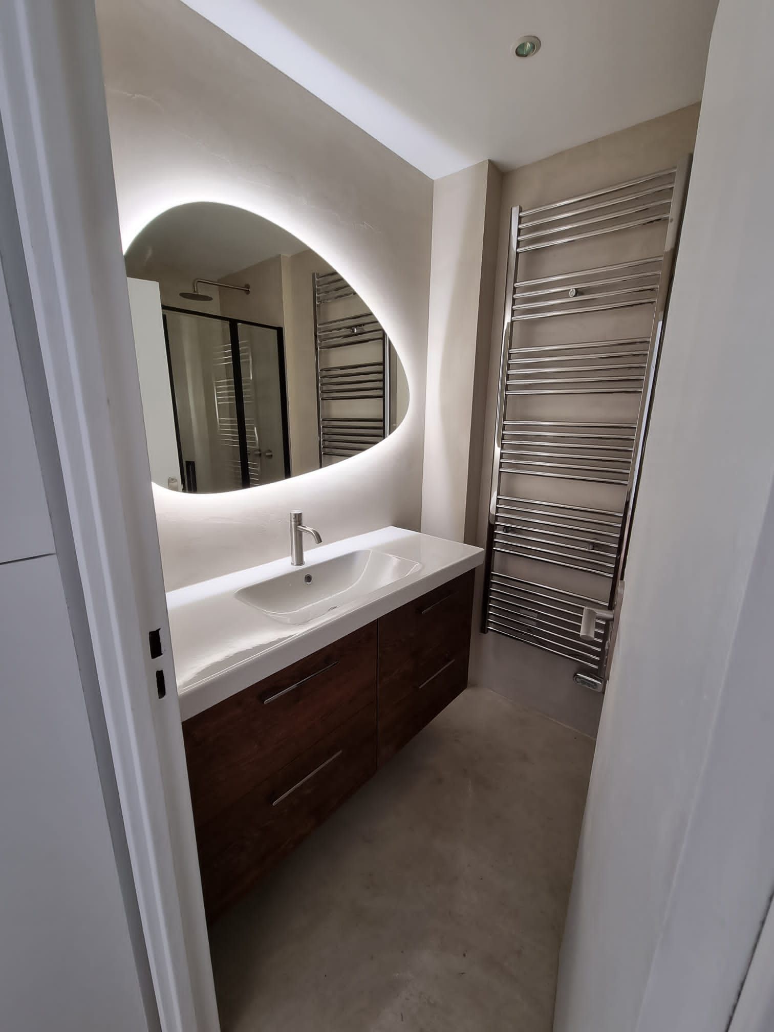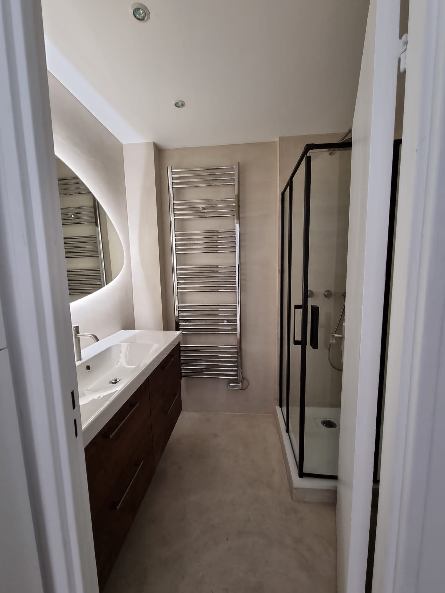 La salle de bain n'a pas été en reste, avec des murs et un sol revêtus de béton ciré taloché pour un effet sobre et luxueux. Pour la rénovation de cette salle de bain à Neuilly sur Seine, nous avons installé un espace lavabo qui dispose d'une double vasque et d'un miroir moderne, tandis que la douche 120x80 est équipée d'une paroi coulissante châssis noir mat et robinetterie noir mat, ainsi que d'un sèche-serviette pour plus de confort.